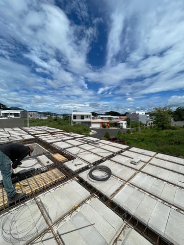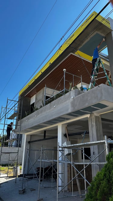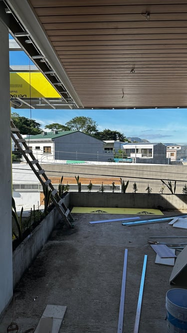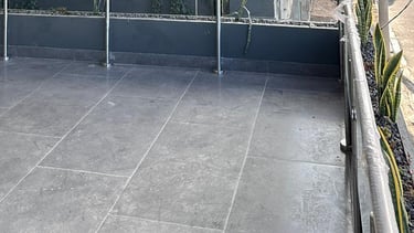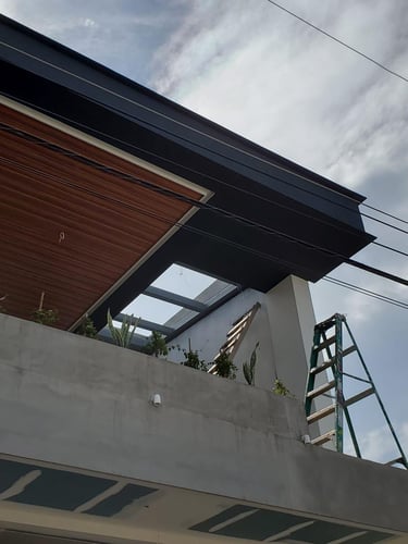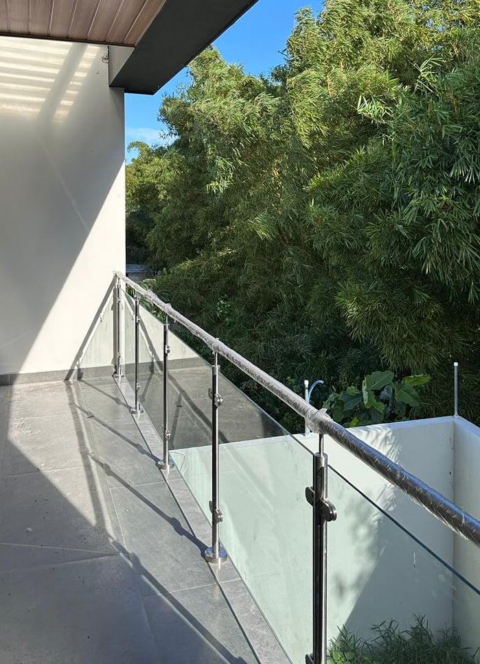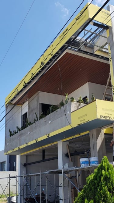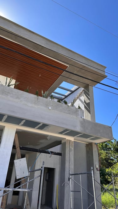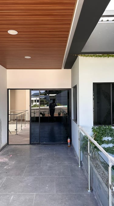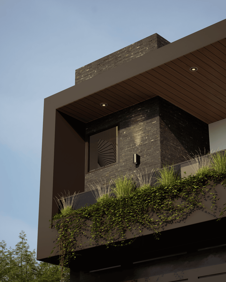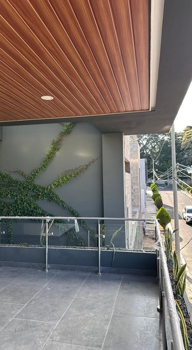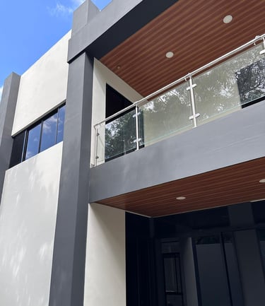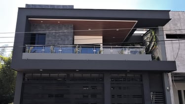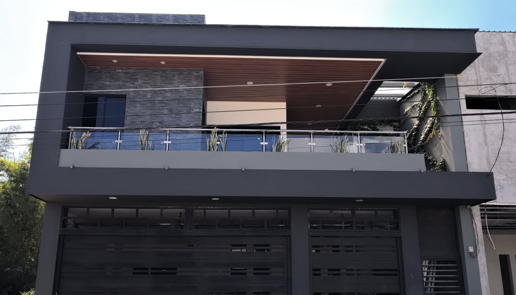 Las terrazas de la vivienda son amplias y están diseñadas con un elegante cielo falso de madera y tablaroca, que complementa la estética moderna. Los pasamanos de vidrio y acero inoxidable proporcionan seguridad y una vista despejada hacia las áreas verdes circundantes. La vegetación, cuidadosamente seleccionada, se adapta perfectamente al diseño de la vivienda, creando un espacio armonioso y tranquilo.