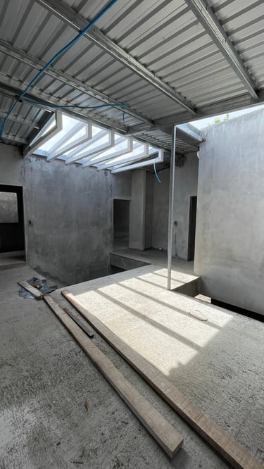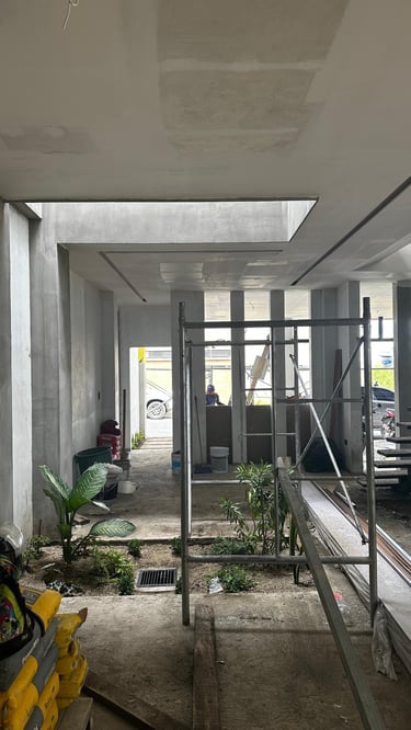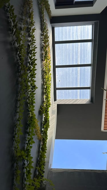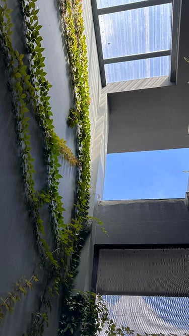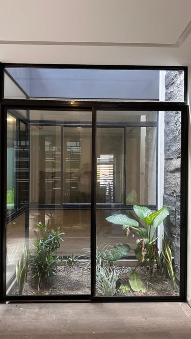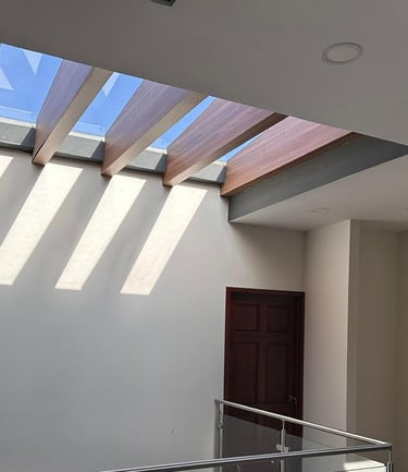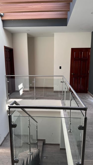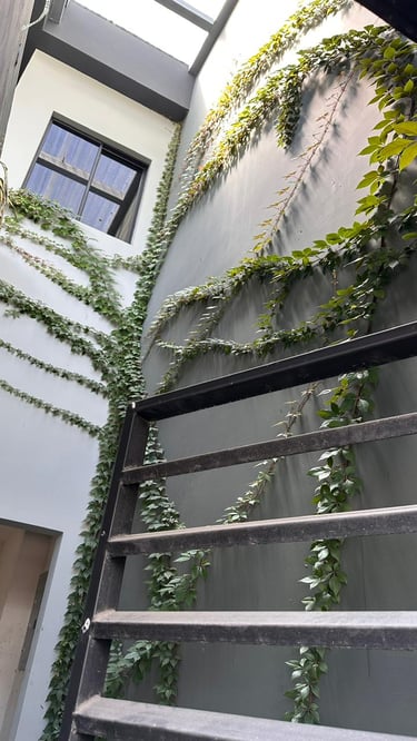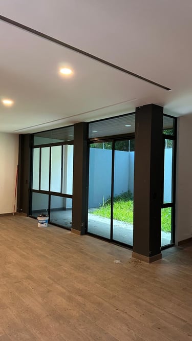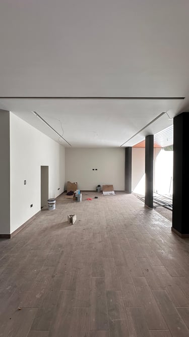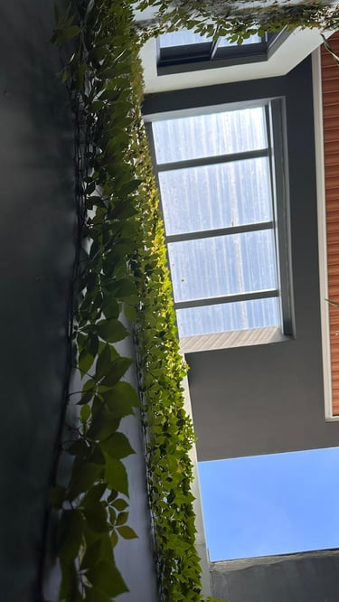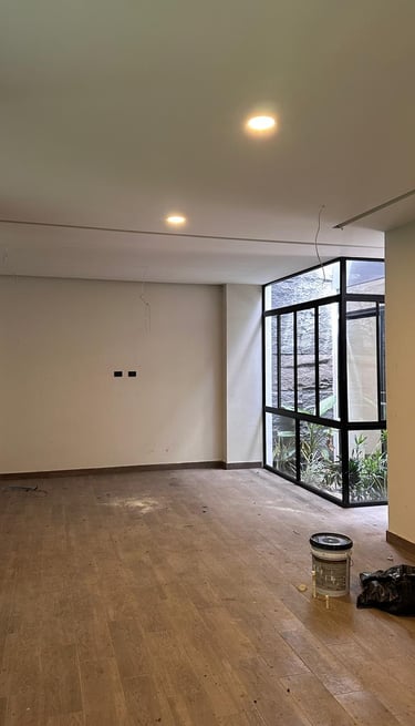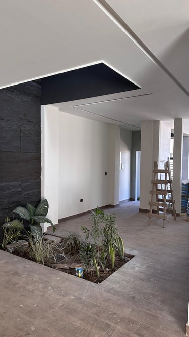 La vivienda presenta interiores con un diseño arquitectónico clásico, donde predominan los colores neutros. Los pisos de porcelanato imitan la calidez de la madera, mientras que las paredes, en un suave tono color hueso, complementan el ambiente. Un cielo falso de tablaroca ofrece un acabado limpio y elegante, contribuyendo a la sensación de amplitud. Los espacios son generosos y bien iluminados, beneficiándose de un tragaluz que permite la entrada de luz natural, enmarcada por una pantalla de vegetación y vidrio que añade un toque de frescura y conexión con el exterior. Esta combinación de elementos crea un espacio acogedor y funcional para la vida familiar.