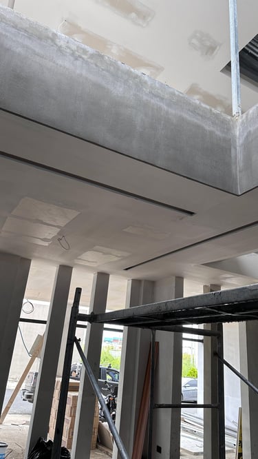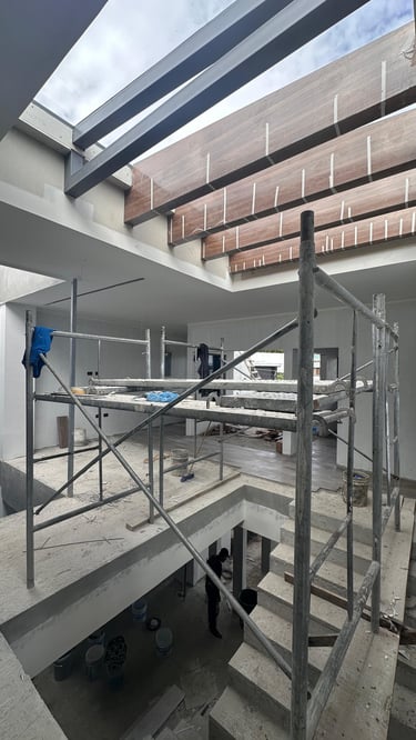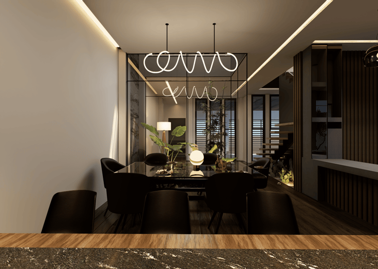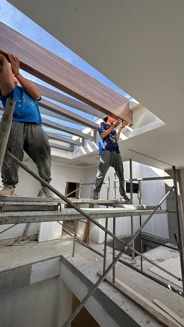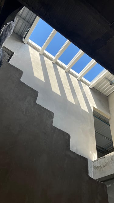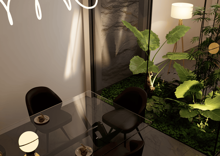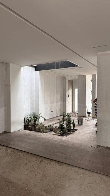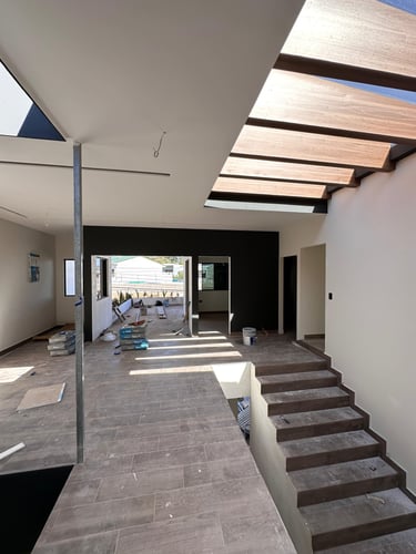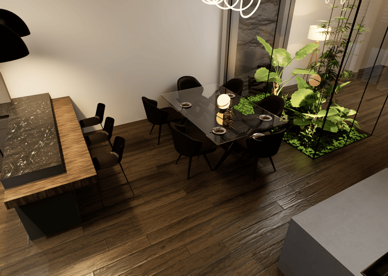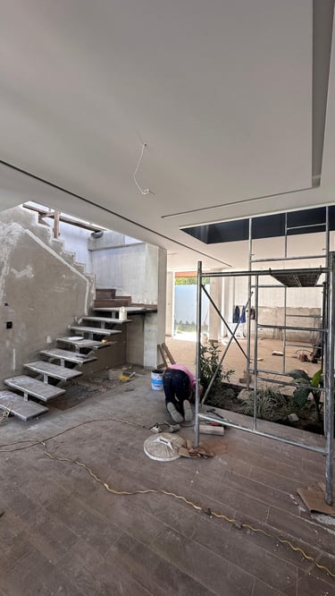 La vivienda presenta interiores con un diseño arquitectónico clásico, donde predominan los colores neutros. Los pisos de porcelanato imitan la calidez de la madera, mientras que las paredes, en un suave tono color hueso, complementan el ambiente. Un cielo falso de tablaroca ofrece un acabado limpio y elegante, contribuyendo a la sensación de amplitud. Los espacios son generosos y bien iluminados, beneficiándose de un tragaluz que permite la entrada de luz natural, enmarcada por una pantalla de vegetación y vidrio que añade un toque de frescura y conexión con el exterior. Esta combinación de elementos crea un espacio acogedor y funcional para la vida familiar.