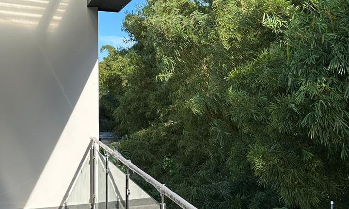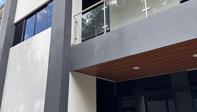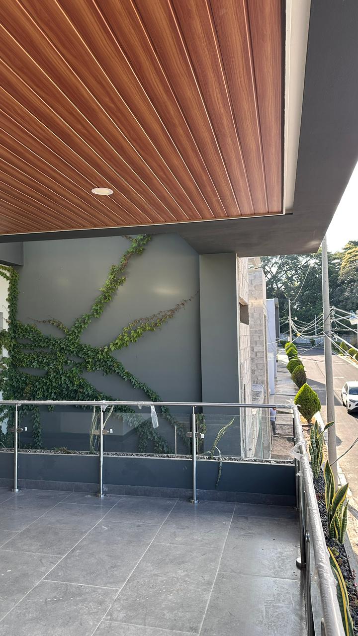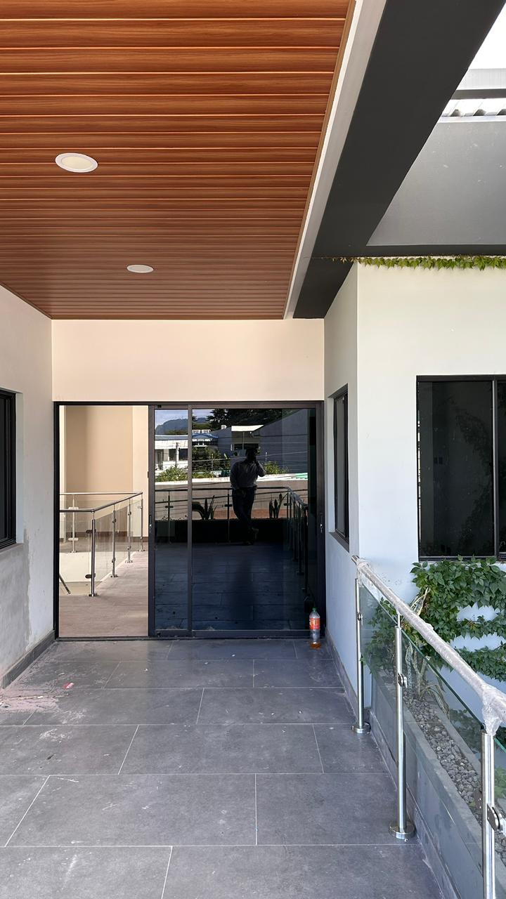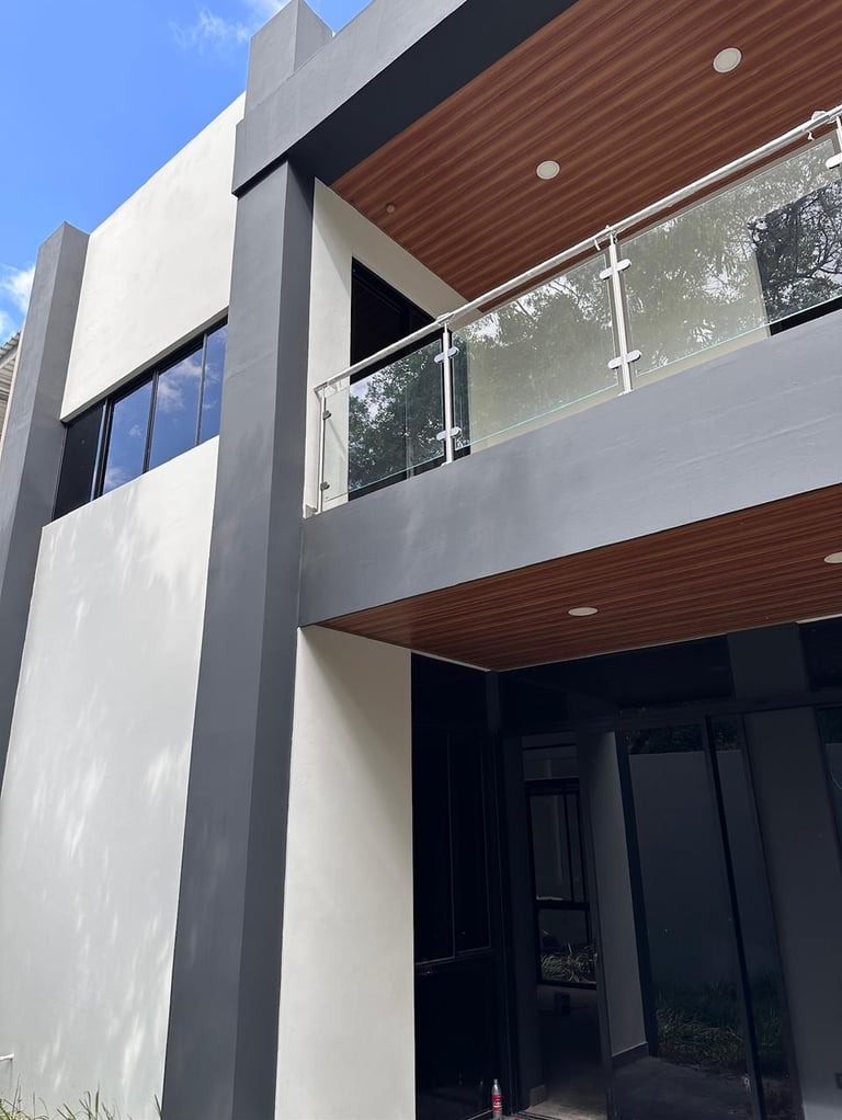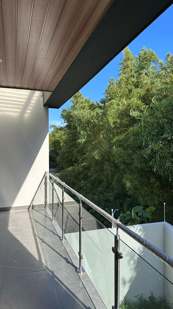 Las terrazas de la vivienda son amplias y están diseñadas con un elegante cielo falso de madera y tablaroca, que complementa la estética moderna. Los pasamanos de vidrio y acero inoxidable proporcionan seguridad y una vista despejada hacia las áreas verdes circundantes. La vegetación, cuidadosamente seleccionada, se adapta perfectamente al diseño de la vivienda, creando un espacio armonioso y tranquilo.