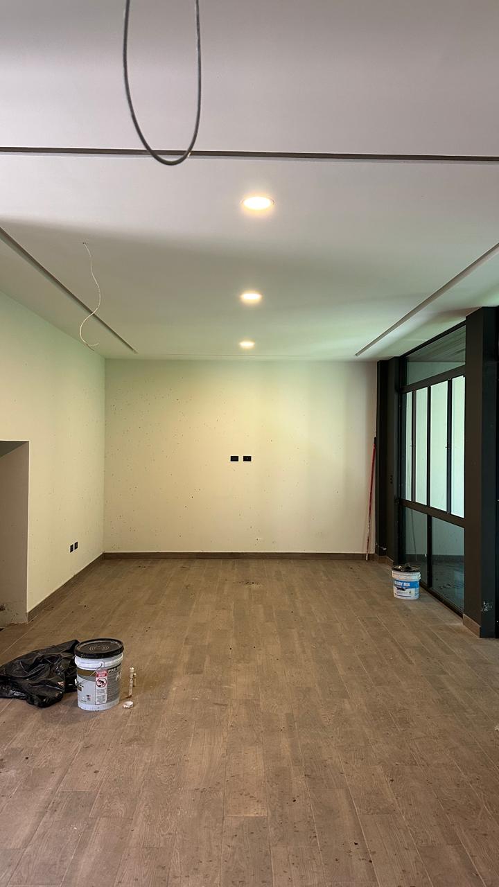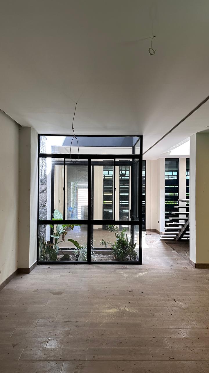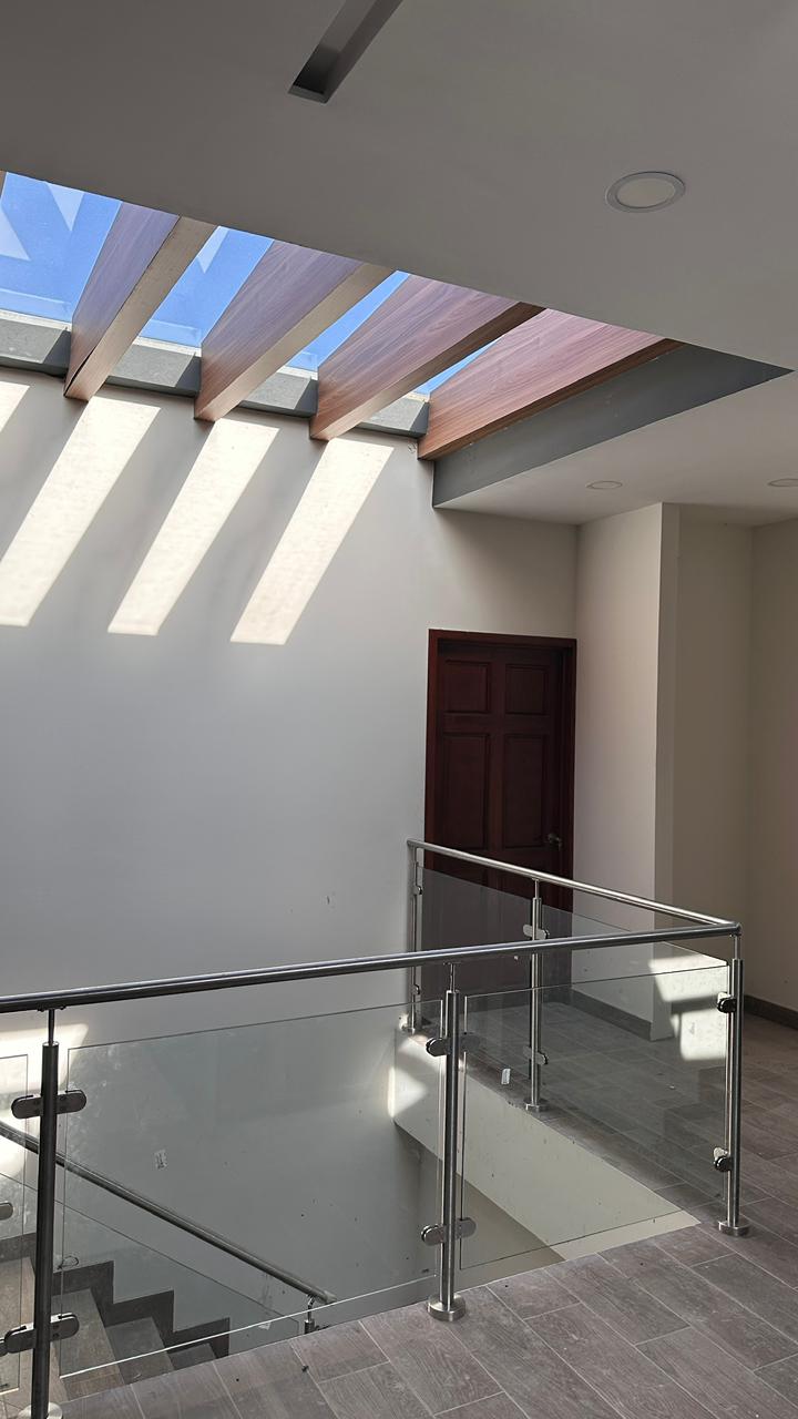 La vivienda presenta interiores con un diseño arquitectónico clásico, donde predominan los colores neutros. Los pisos de porcelanato imitan la calidez de la madera, mientras que las paredes, en un suave tono color hueso, complementan el ambiente. Un cielo falso de tablaroca ofrece un acabado limpio y elegante, contribuyendo a la sensación de amplitud. Los espacios son generosos y bien iluminados, beneficiándose de un tragaluz que permite la entrada de luz natural, enmarcada por una pantalla de vegetación y vidrio que añade un toque de frescura y conexión con el exterior. Esta combinación de elementos crea un espacio acogedor y funcional para la vida familiar.